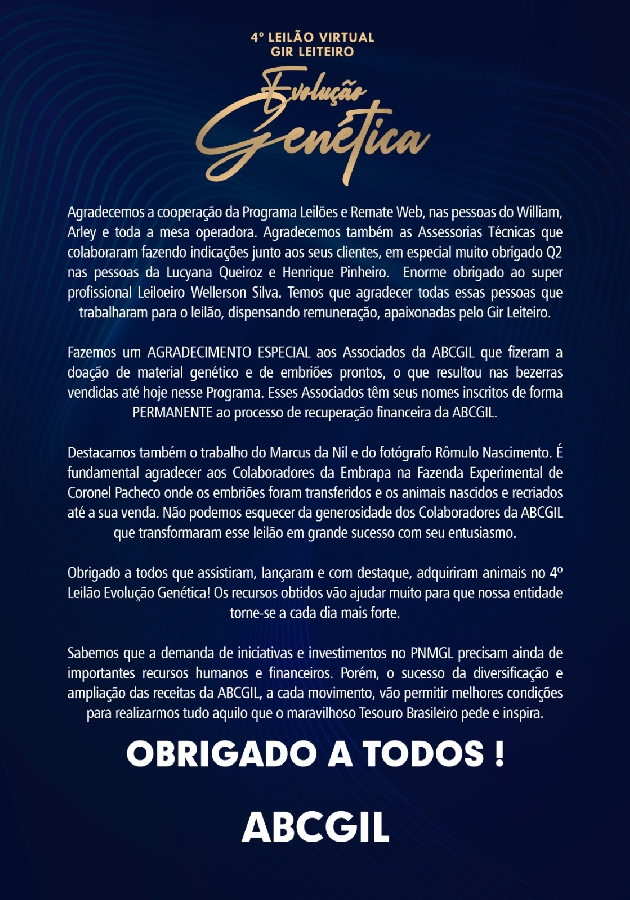 Agradecimento 4º Leilão Virtual Gir Leiteiro Evolução Genética